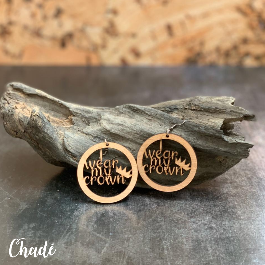 I wear my crown, circular-shaped wooden earrings,